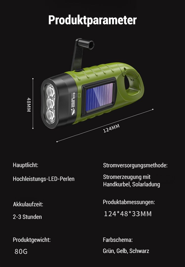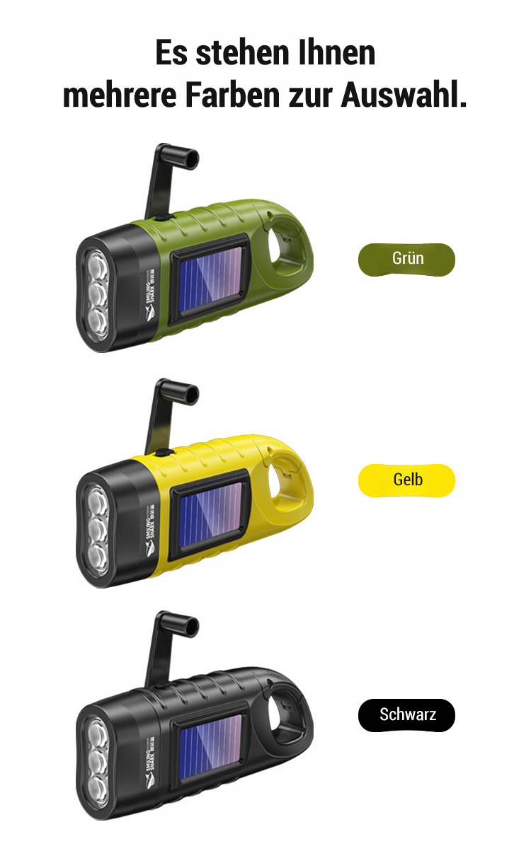 Taschenlampe mit Solar- und Handkurbelantrieb